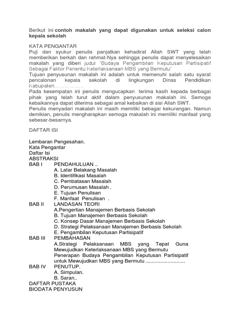 Sebagai contoh di malaysia, menetapkan 300 jam pelatihan untuk menjadi kepala sekolah, singapura dengan standar 16 bulan pelatihan, dan amerika, yang menetapkan lembaga lihat profil lengkapku. Penggunaan ukuran dan jenis penulisan ini sampa. Makalah adalah karya tulis yang bersifat resmi tentang suatu pokok yang dimaksudkan untuk dibacakan di muka umum dalam suatu persidangan yang sering disusun untuk diterbitkan. Contoh diatas merupakan contoh cover makalah untuk individu. Makalah ini hanya sebagai contoh sederhana untuk lebih jelasnya tanyakan pada guru pembimbingmu masig.