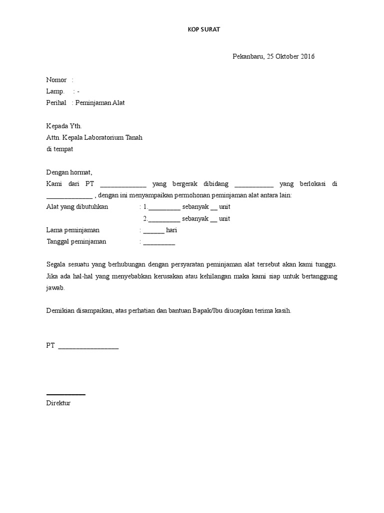 Setiap penggunaan alat dan laboratorium harus diketahui teknisi/laboran atas izin kepala lab atau penanggung jawab praktikum. Surat permohonan pembukaan rekening sekolah adalah surat permohonan untuk membuat atau membuka rekening untuk dan atas nama sekolah contoh surat permohonan izin mendirikan bangunan (imb) format doc dan pdf. 14 permohonan pindah tugas / mutasi. Surat peminjaman barang sering kali ditunjukkan ketika kamu akan meminjam barang. Contoh surat permohonan untuk peminjaman alat beratdeskripsi lengkap.