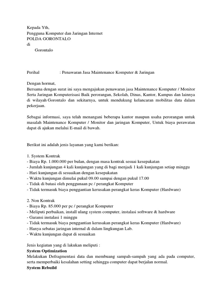 Contoh surat penawaran jasa service. Contoh surat penawaran produk alat rumah tangga. Demikianlah contoh surat penawaran harga, jasa cleaning service. Harga di atas hanya berupa service saja, jika ada pergantian komponen akan ada biaya tambahan sesuai harga komponen yang diganti. Sebagai informasi, surat penawaran barang dan hargaadalah surat yang dibuat dan ditujukan kepada suatu perusahaan yang tujuannya yaitu untuk menawarkan untuk lebih memperjelas materi terkait surat penawaran barang dan harga ini, berikut kami cantumkan beberapa contoh surat. Contoh surat penawaran jasa konsultan. Biasanya surat penawaran ini dibuat oleh para pengusaha atau pebisnis dalam segi ekonomi berupa negosiasi. Cth penawaran krj dan harga spare part gense. Adapun keuntungan dengan adanya kerja sama service dan tmaintenance ini adalah gedung perkantoran anda akan terasa lebih nyaman karna kondisi ruangan. Untuk lebih jelasnya, anda bisa melihat contoh surat penawaran jasa service genset di bawah ini. 5 contoh surat penawaran pengadaan barang. Jenis surat penawaran ini seringkali dikeluarkan oleh perusahaan penghasil penawaran jasa pemasangan, perbaikan dan perawatan ac. Menulis surat penawaran jasa terbilang mudah dan sama saja dengan penawaran produk.