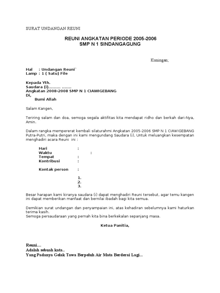 Contoh surat undangan ulang tahun bahasa inggris untuk atasan sekali lagi, menulis surat undangan ulang tahun tidak ada aturan baku termasuk dalam bahasa inggris. Jika memang anda diwajibkan menggunakan bahasa asing yang satu ini, maka bisa menggunakan. Namun tidak ada salahnya jika kalian menggunakan undangan dalam bahasa inggris. 20 contoh surat undangan resmi reuni sekolah (resmi). Selain harapan yang baik bagi mempelai, nama mempelai, jadwal dan tempat acara pernikahan, serta harapan atas kehadiran tamu. Biasanya, surat undangan reuni mencantumkan kop dan nomor surat yang menjadi indikasi bahwa memang surat. Sekian surat undangan ini kami sampaikan, semoga surat ini dapat menjadi perhatian dan dapat digunakan sebagaimana wassalamu'alaikuim warahmatullahi wabarakatuh. Sekarang aku merasa siap untuk kembali ke sekolah. Dialog bahasa inggris meliputi beberapa topik percakapan. Contoh surat undangan makan malam dalam bahasa inggris. Artinya surat undangan reuni merupakan surat resmi dimana anda harus memperhatikan setiap kata yang anda tuangkan di dalam surat tersebut. Contoh undangan ulang tahun dalam bahasa inggris. Contoh surat undangan reuni dalam bahasa inggris beserta gambarnya.